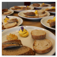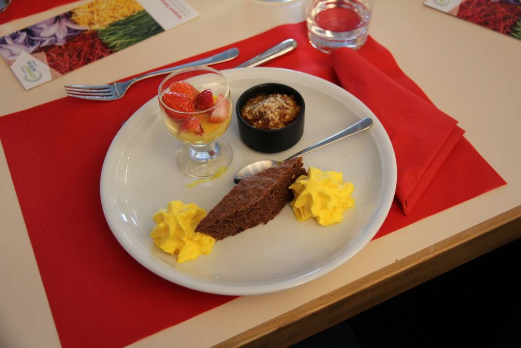 Damit wir uns ein Bild machen können, wie vielfältig Safran ist, bekommen wir diverse Safran-Häppchen mit entsprechendem Safran-Sekt und Safran-Sirup zum Essen. Herrlich! Dann geht es weiter mit der Theorie. Sie erklärt uns, dass im Moment die Pflücker auf dem Feld sind und die Blüten ernten, die sie im Anschluss hier manuell weiterverarbeiten.