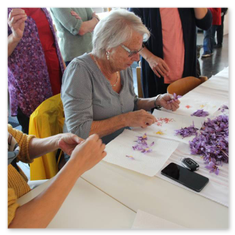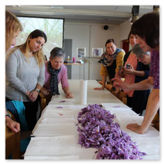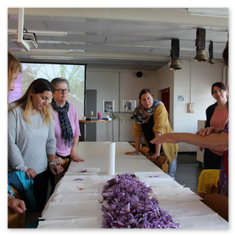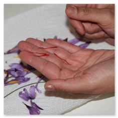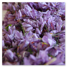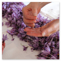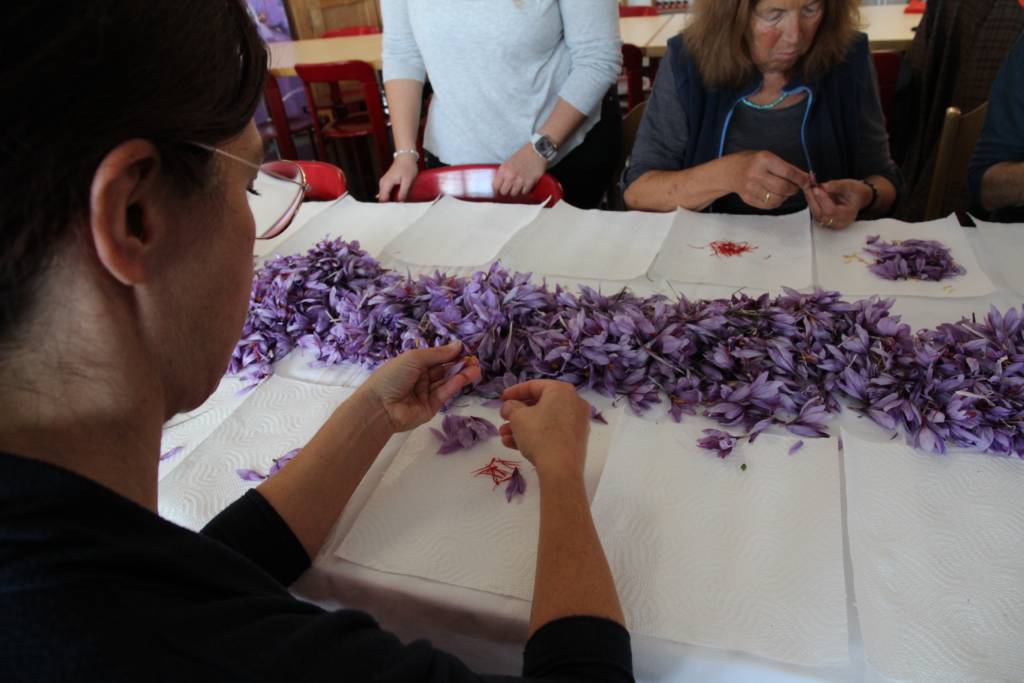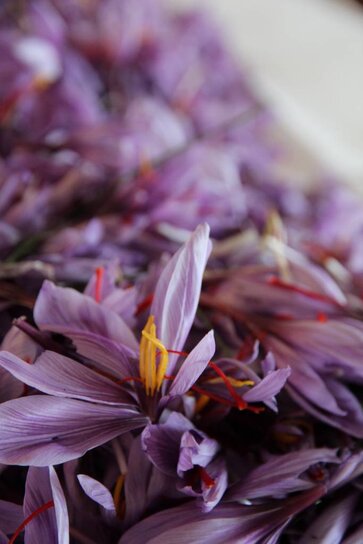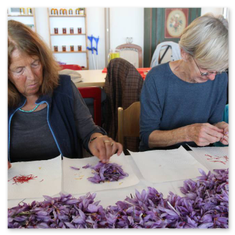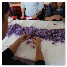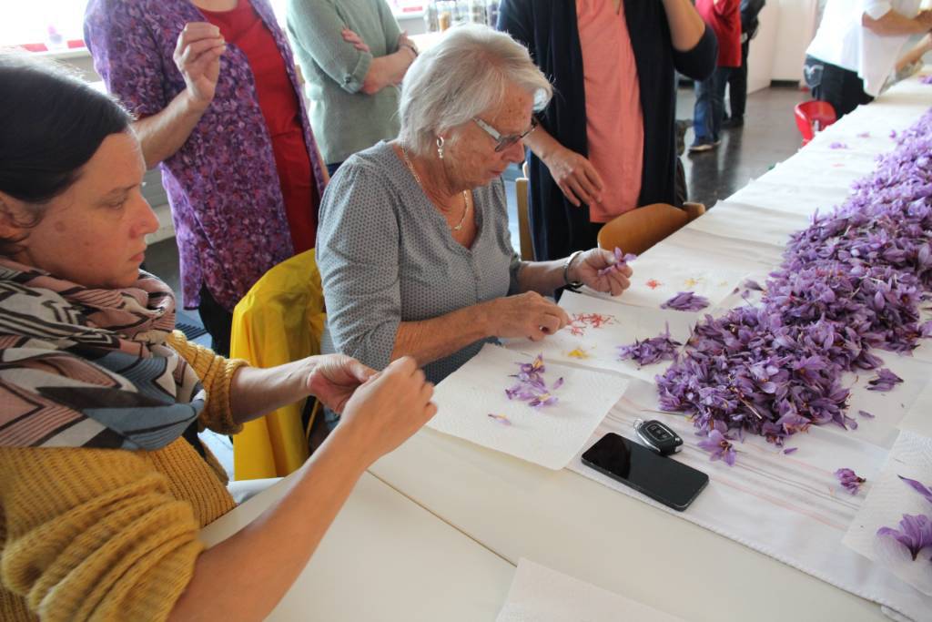 So ist es auch. Um 15 Uhr kommen die Helfer vom Feld zurück und beginnen gleich mit der Arbeit. Sie trennen die Safran-Fäden von der Blüte. Unglaublich, wie geschickt und schnell sie arbeiten. Wir dürfen es auch versuchen und merken schon bald, dass wir als Ungeübte vier Mal so lange brauchen würden. Es ist faszinierend, mit welcher Hingabe sie diese Sisyphusarbeit bewältigen. Innert kurzer Zeit ist der Blütenberg verschwunden und Häufchen mit Safran-Fäden liegen zur Weiterverarbeitung bereit. Die Helfer verabschieden sich. Morgen steht schon die nächste Ernte an.
